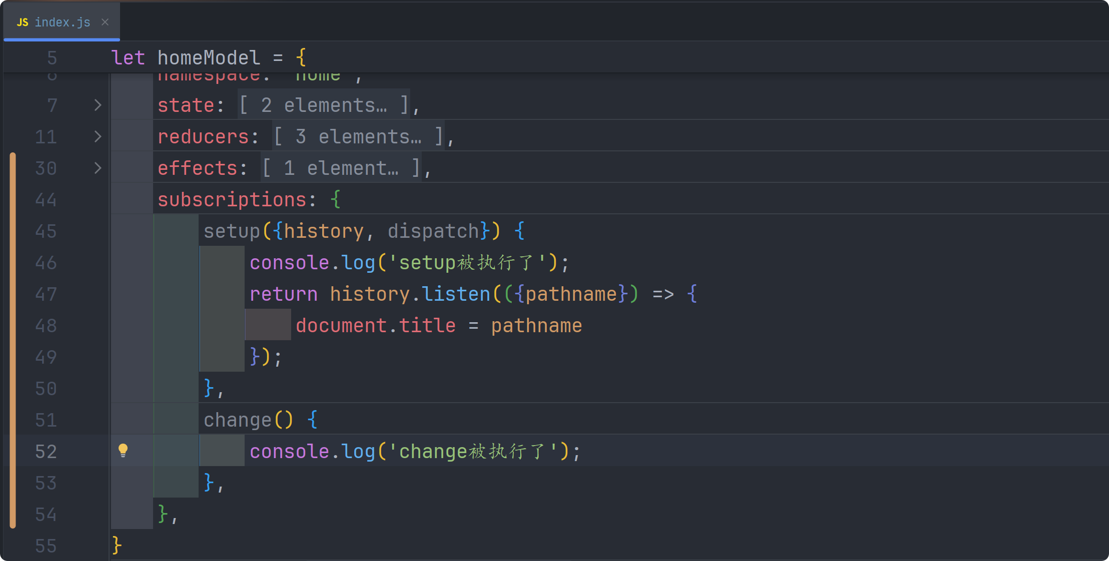 是不是分别输出了 setup被执行了 与 change被执行了,是不是就验证了我的说法,只要定义在 Subscription 中的方法,都会被调用,而且默认调用的时候还会给你传递一个对象,可以从该对象中解构出一些需要使用的内容,比如 history,dispatch。解构 history 你是不是就可以监听 history 的变化,解构出 dispatch,是不是可以在当前的方法做完一些业务逻辑之后再通过 dispatch 派发一些其它任务出去,对吧,好了这个呢就是 subscriptions,就给大家介绍完毕了。