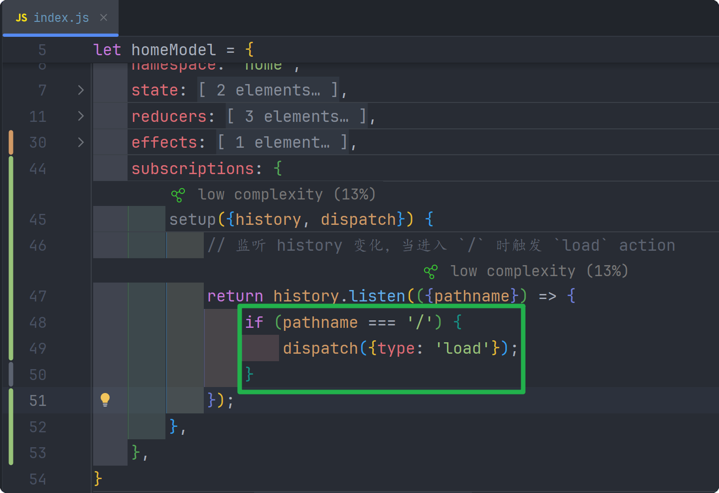 这里呢就是解构了一个 history 与 dispatch,解构出了 history 之后怎么办,接下来就可以监听一个 history 的一个变化,监听变化呢,就可以拿到变化之后的路径地址也就是 pathname。