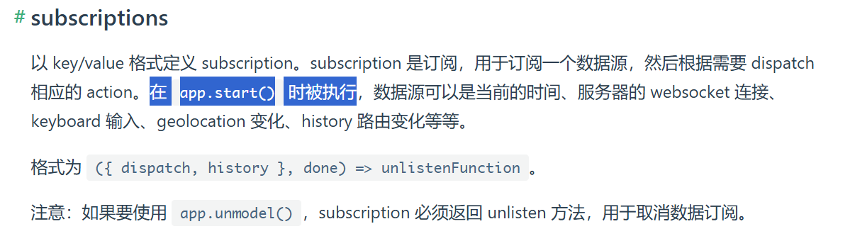 },subscriptions 会在 app.start 的时候自动来执行 subscriptions 中所有的函数: