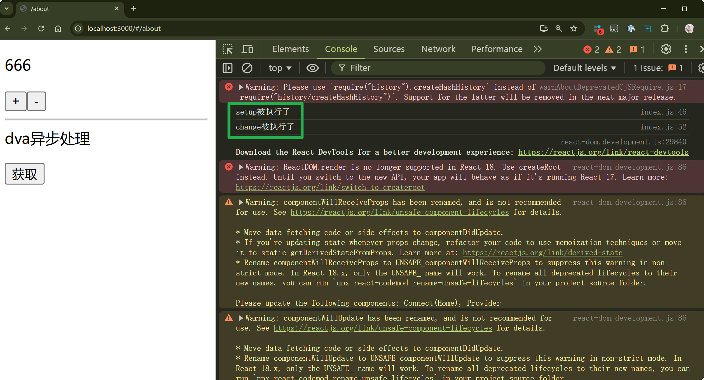 是不是只要我调用了 app.start() 就会执行了,自动去执行 subscriptions 中所有的方法,比如说我在 subscriptions 中定义一个 change 的方法,分别在 setup 与 change 中用 console.log 打印一些日志看看: