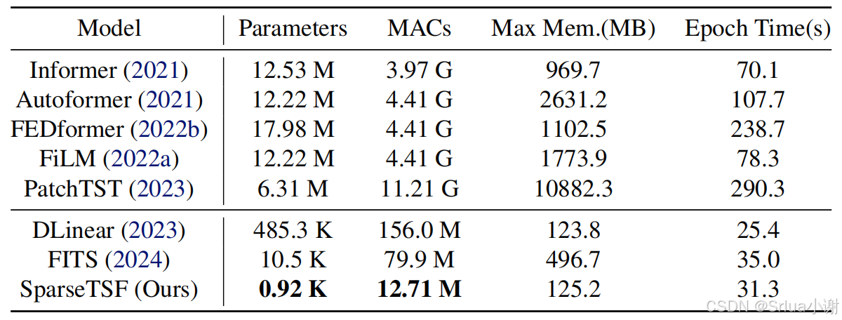 下表展示了SparseTSF与其他主流模型在Electricity数据集上的静态和运行时指标比较,包括模型参数、MACs(乘累加操作数)、最大内存使用量和每个epoch的训练时间。SparseTSF在这些指标上显著优于其他模型。