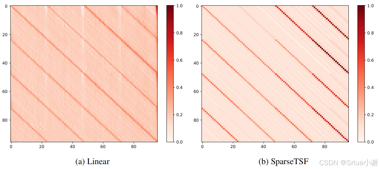 在图a中,线性模型学习到的权重分布呈现出较为均匀的条纹状模式。这些条纹代表了模型从数据中提取的周期性特征。图b展示了SparseTSF模型学习到的权重分布。与线性模型相比,SparseTSF模型的权重分布呈现出更明显、更密集的等间距条纹。这表明SparseTSF模型在提取周期特征方面更为有效,能够更准确地捕捉时间序列数据中的周期性模式。这是因为SparseTSF的按周期ww降采样后预测的策略,给了模型一种更有效的利用时序数据周期特性的bias。