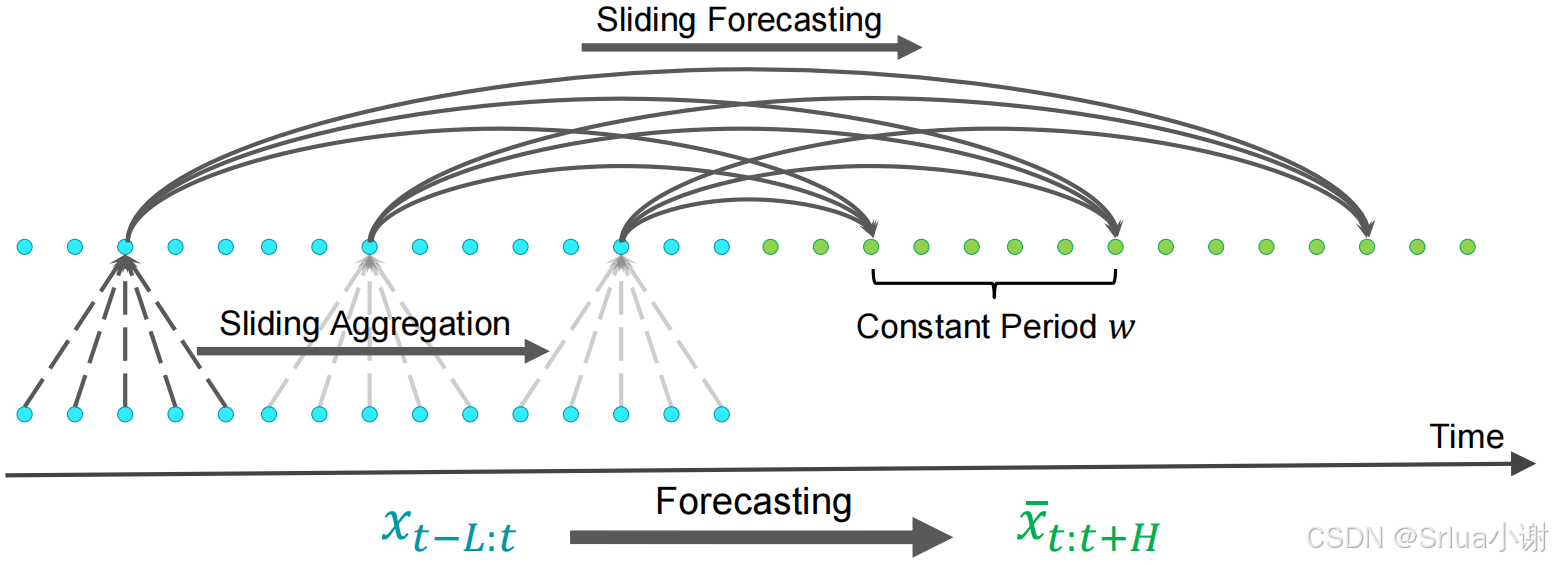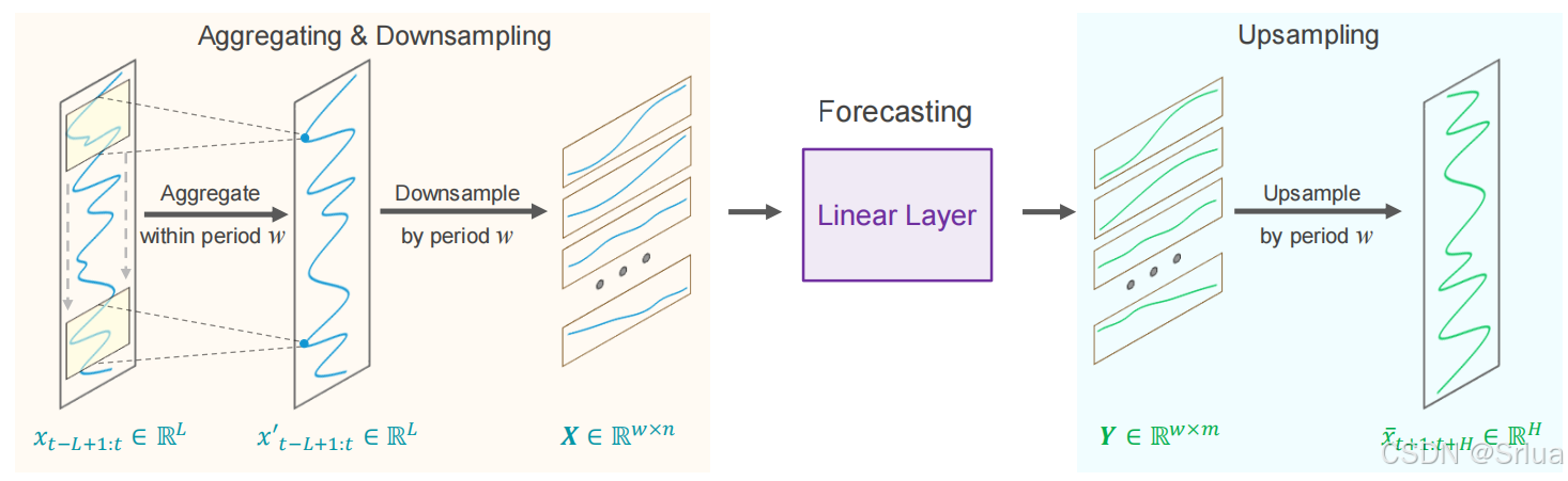 假设时间序列xt−L+1:t(i)xt−L+1:t(i)具有已知的周期性ww,首先将原始序列下采样成 ww 个子序列,每个子序列的长度为 n=⌊Lw⌋n=⌊wL⌋。然后,对这些子序列进行预测。预测后,将 ww 个子序列上采样回完整的预测序列,每个子序列的长度为 m=⌊Hw⌋m=⌊wH⌋。
