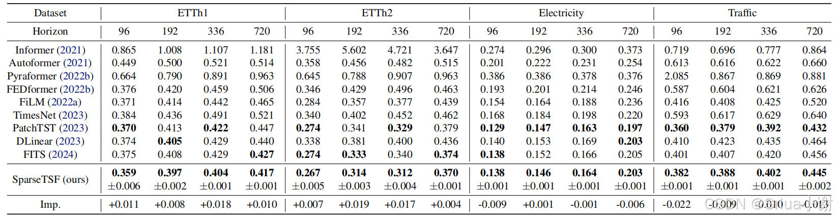 下表展示了SparseTSF与其他基线模型的性能比较。SparseTSF在所有情况下都排名前两位,以显著较小的参数规模达到或接近最先进的预测水平。SparseTSF的结果的标准差也非常小,表明模型的鲁棒性。