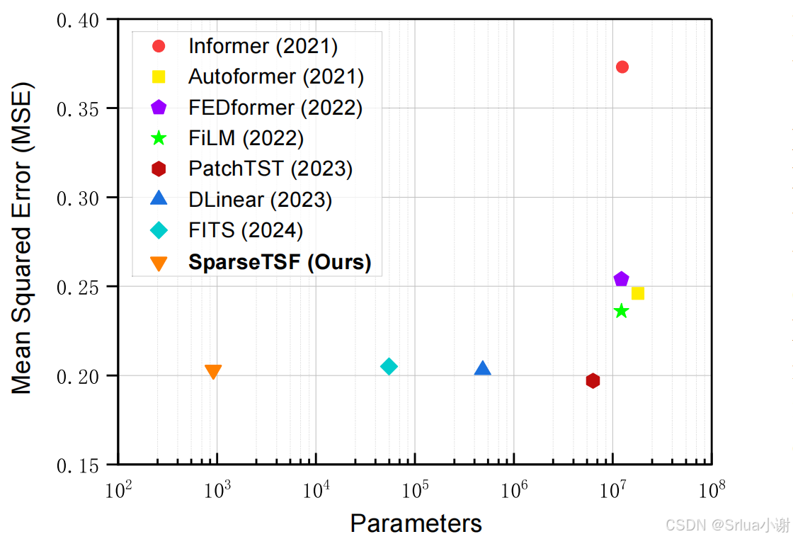 SparseTSF模型采用了交叉周期稀疏预测技术,通过下采样原始序列来专注于跨周期趋势预测,有效地提取周期特征,同时最小化模型的复杂性和参数数量。SparseTSF模型使用不到1k个参数,如下图,与现有模型相比,在参数规模上小了一到四个数量级,并且实现了接近SOTA的效果。