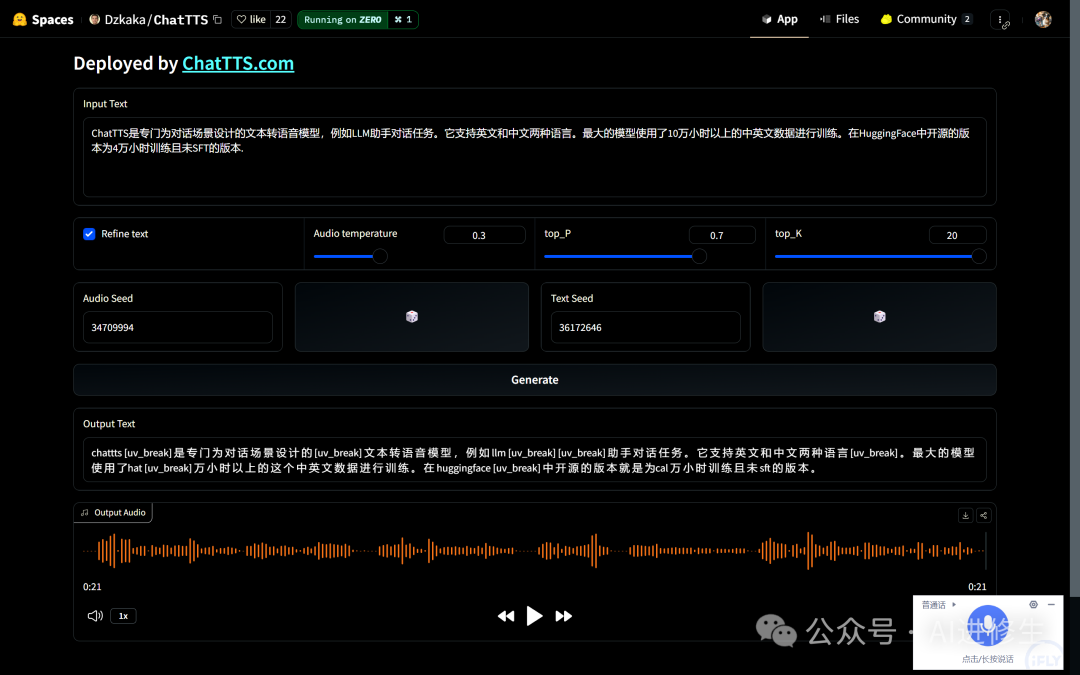 体验地址:https://huggingface.co/2Noise/ChatTTS
