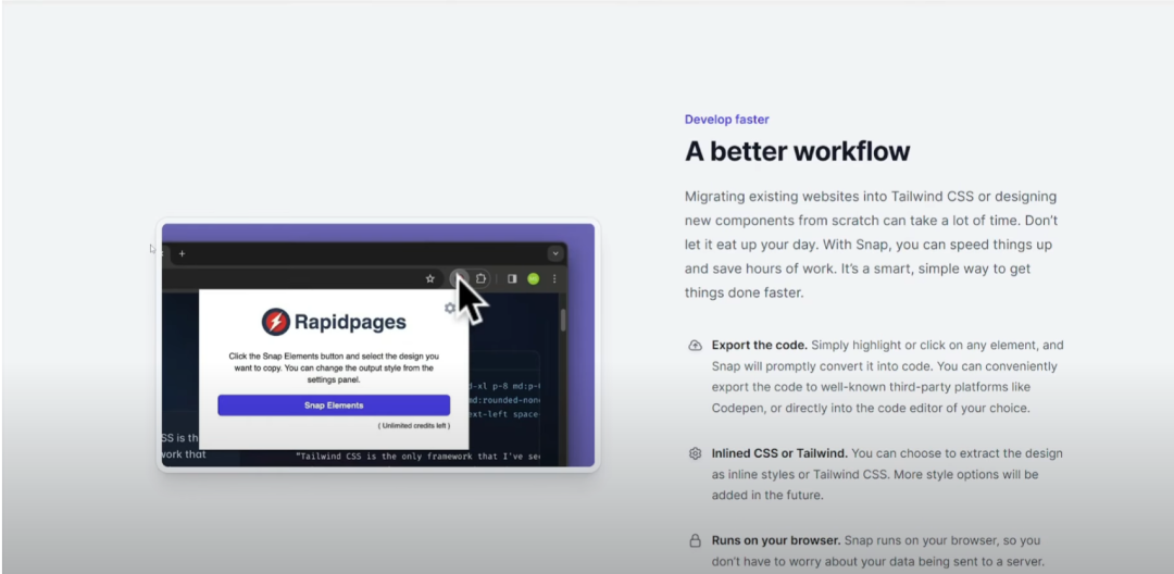 现在,最让我印象深刻并让我想尝试这个框架的一件事是,他们有一个有趣的工具,叫做Snap。它基本上可以将实时网页设计转换为代码。