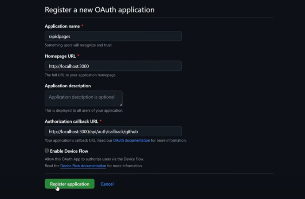 对于主页URL,回到这个GitHub仓库,复制这个URL(这是localhost),将其粘贴到主页URL中。对于授权回调URL,复制第二个URL。
