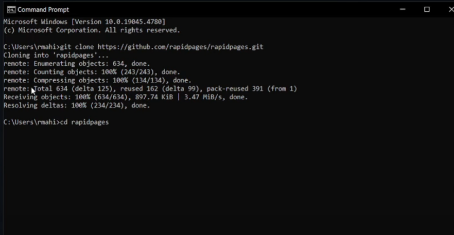 所以你首先要做的是前往RapidPages的GitHub仓库克隆它,然后前往RapidPages文件夹,简单地输入`cd rapidPages`。