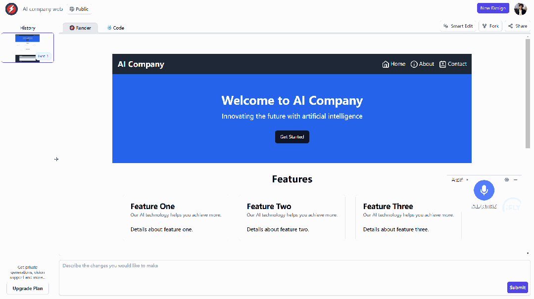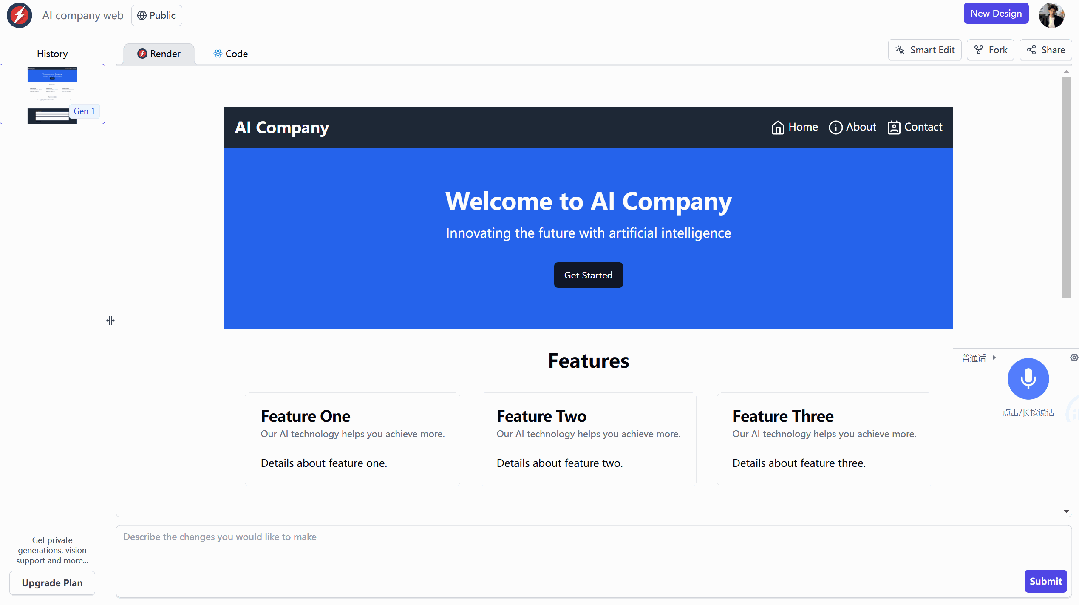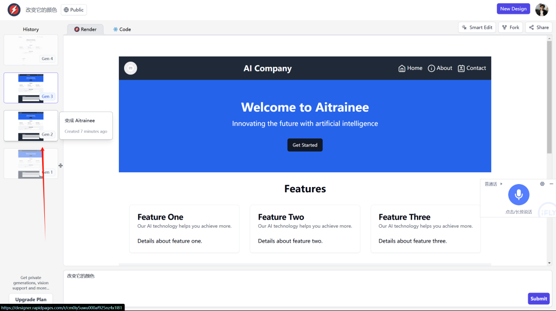 我使用RapidPages创建了一个简单的AI公司官网,它首先渲染出设计,然后在另一个选项卡中提供代码。
