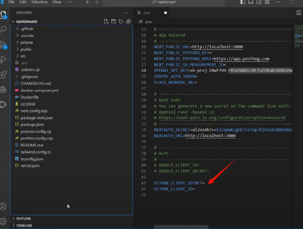 接下来,我们要输入API密钥。打开VS Code,点击打开文件夹,打开刚刚克隆的文件夹。一旦找到RapidPages文件夹,前往`.env`文件。在开始粘贴内容之前,右键点击此文件,选择重命名,去掉“.example”。
