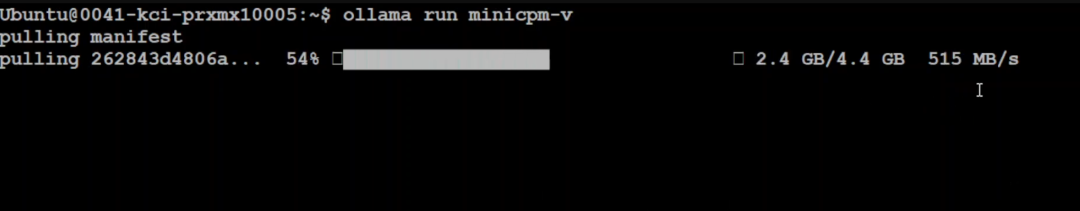 现在 Ollama 已经升级好了,让我们回到 Ollama 的 MiniCPM 页面,下载 MiniCPM 视觉模型。回到终端,运行命令开始下载,模型的大小大约是 4.44 GB,下载后它会进行校验。