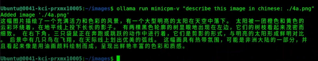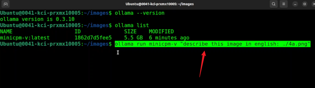 我已经在图像目录中,想要描述图像的话,运行 `ollama run` 命令,后面跟上模型名称、提示词和图像文件名。