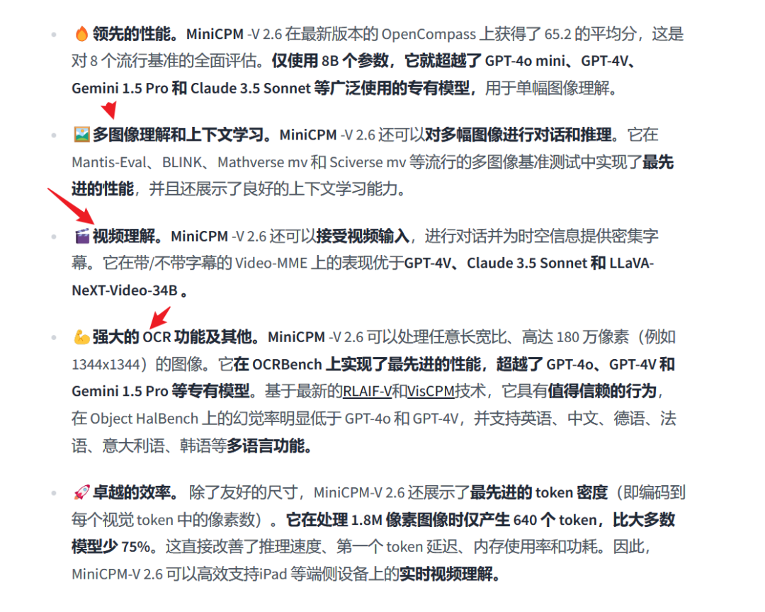 与 MiniCPM-Llama3-V 2.5 相比,它的性能有了显著提升,并引入了用于多图像和视频理解的新功能。MiniCPM-V 2.6 的显著特点包括: