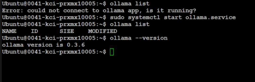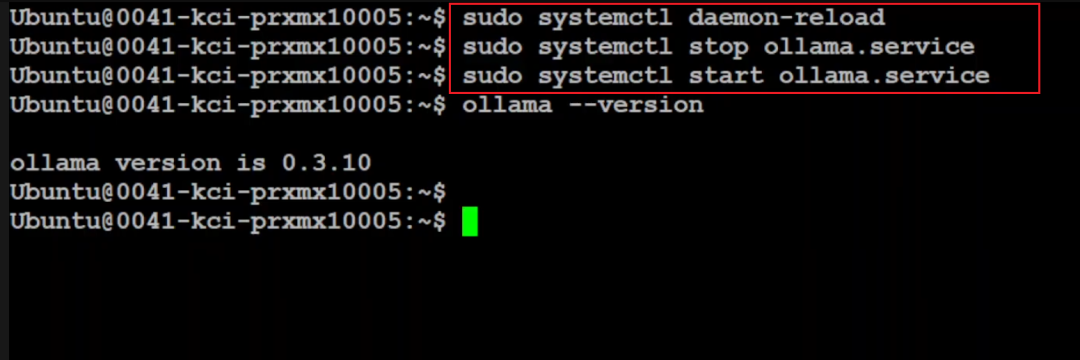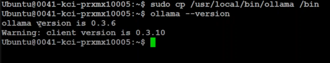 虽然 Ollama 已升级到 3.10 版本,但客户端还是 3.6,所以我们还需要升级客户端。虽然已经升级了,但我们需要重新加载系统守护进程和服务。所以重新加载守护进程,然后停止 Ollama 服务,接着重新启动它。现在如果再次运行 `Ollama --version`,你会看到版本已经是 3.10。
