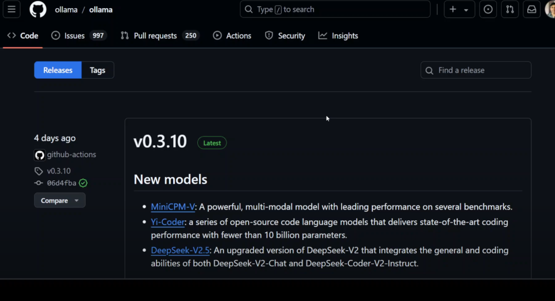 如果你访问 Ollama 的发布页面,你会发现最新的版本是 3.10,这个版本支持 MiniCPM 视觉模型 和 DeepSeek 模型。
