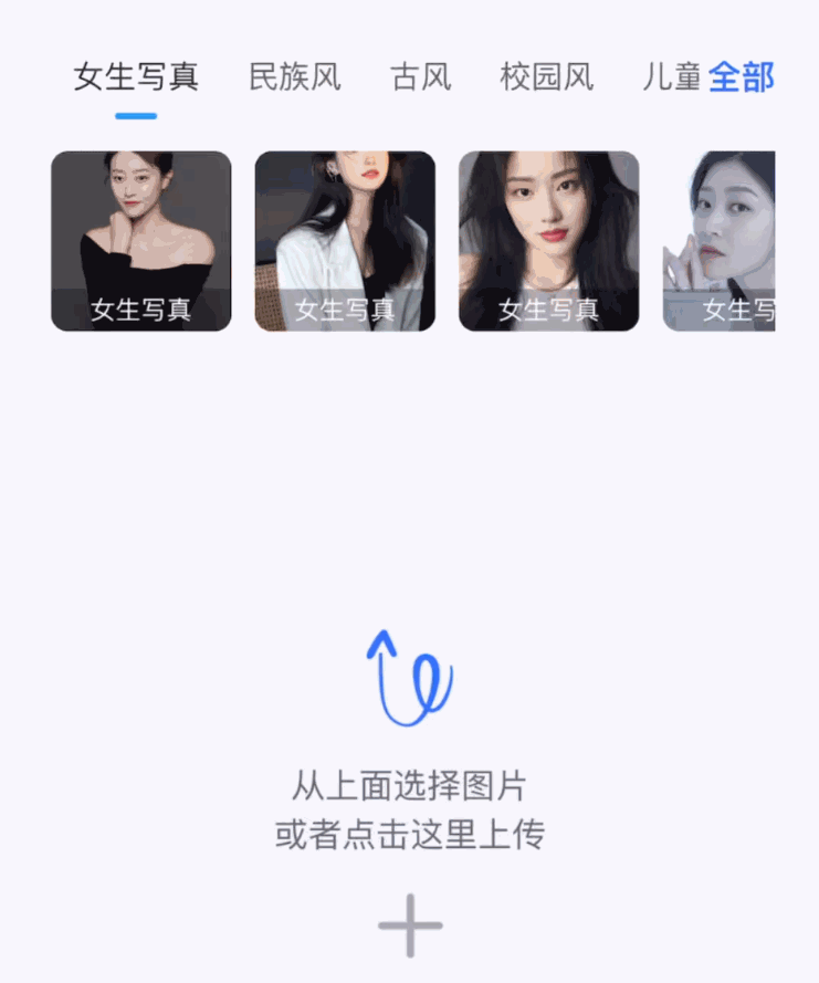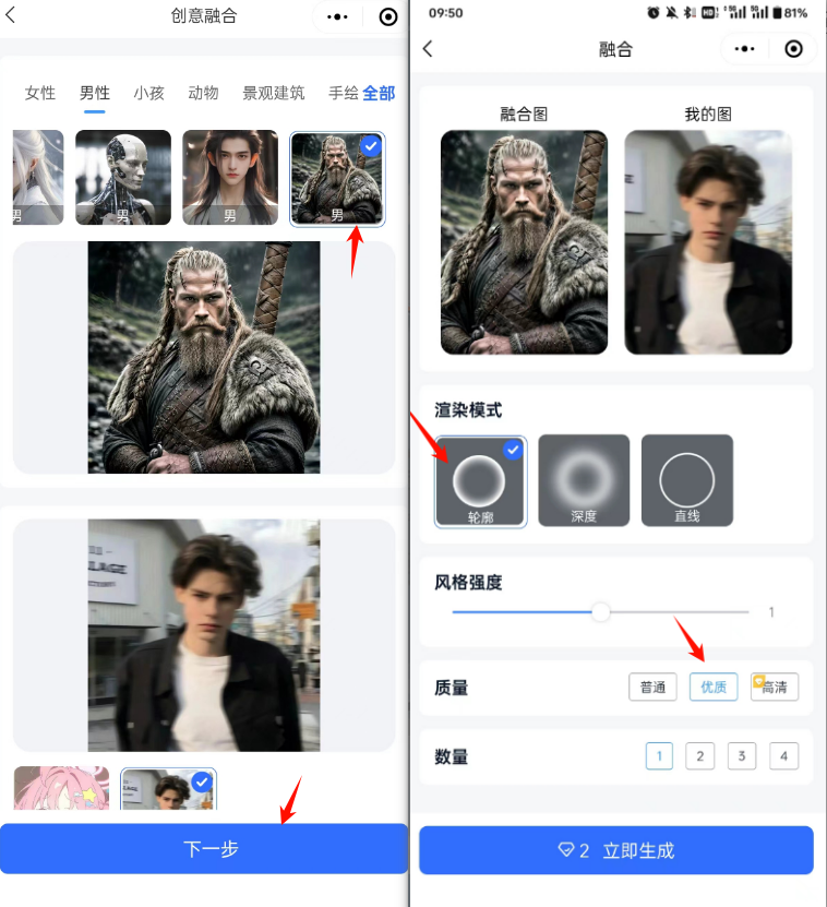 又比如,在创意融合功能中,我先选定一个硬汉形象,接着上传自己的头像。