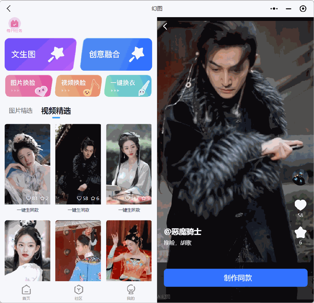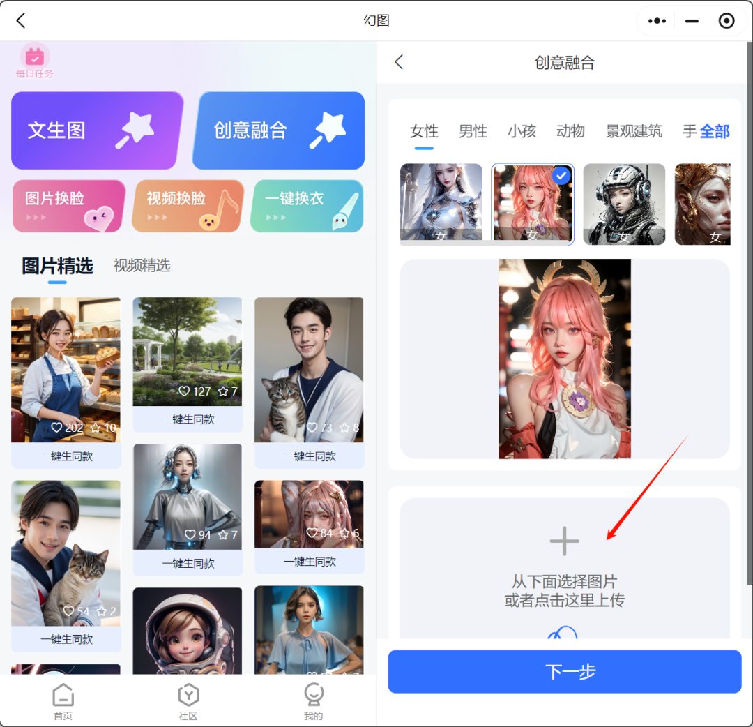 除了上面的换装换脸功能外,幻图AI还提供创意融合功能: