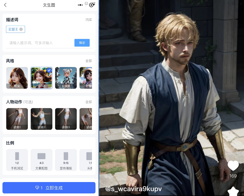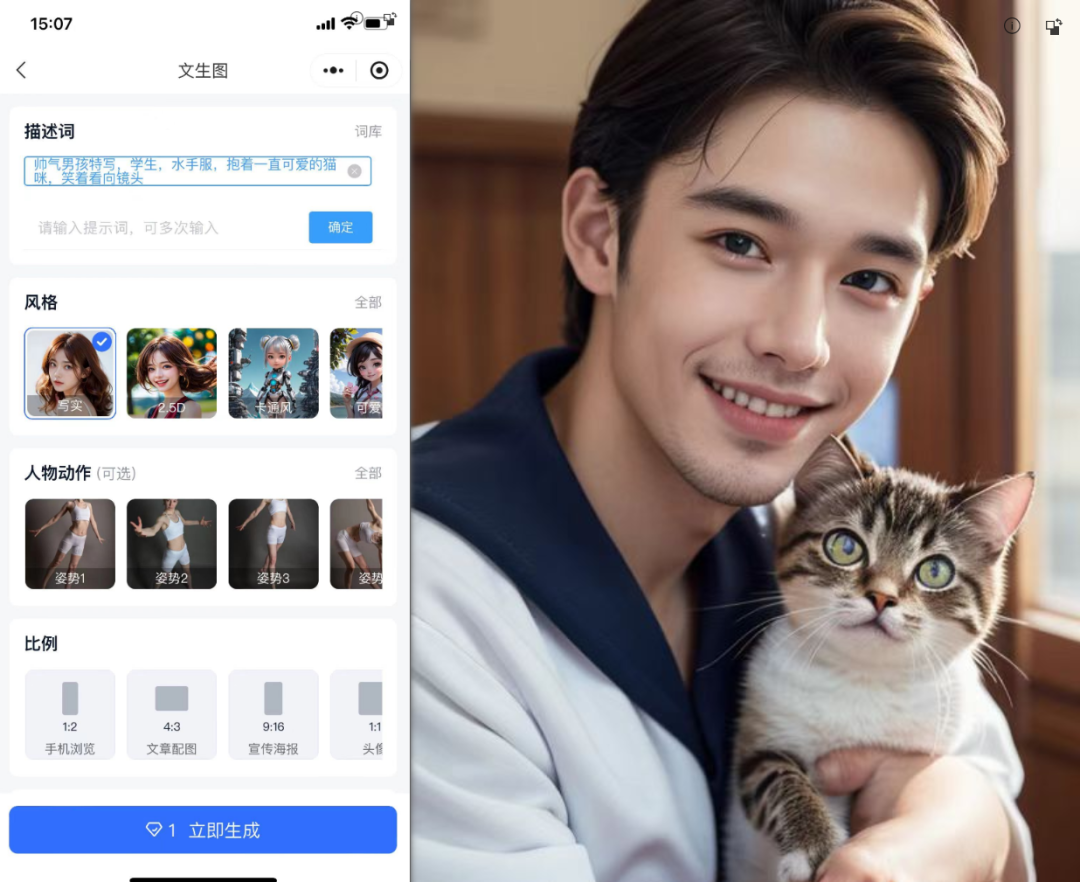 当然,作为一个AI绘画工具,最基础的文字生成图片当然少不了。它可以选择不同的风格、人物动作和比例模板,这一切都很酷。