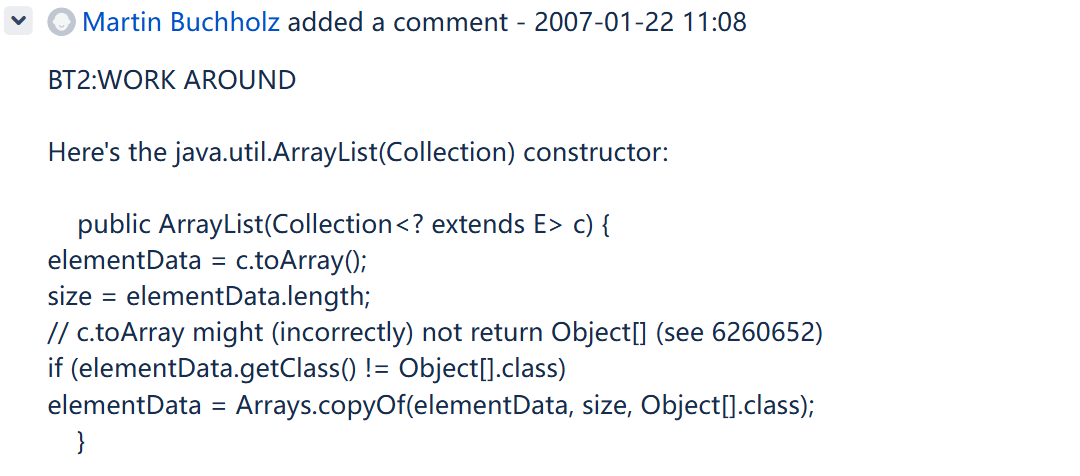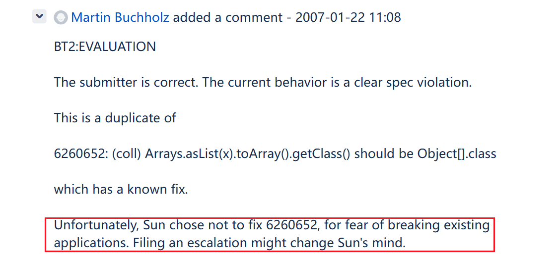 之所以在 java.util.ArrayList 对这个 Bug 做特殊的处理是因为 Sun 公司在当时选择不修复改这个Bug,因为怕修复了之后已有的代码就不能运行了。如下图所示: