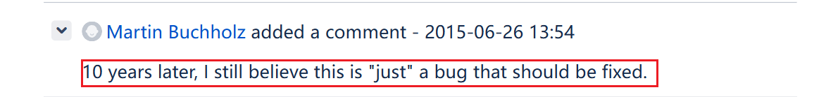 因为修复了这个 Bug 之后,编译器并不能告诉你原来的代码存在问题,甚至连新的警告都没有。假设你从 JDK 8 升级到 JDK 9 了,代码也没有改,但是突然功能就用不了,这个时候你想不想骂人,哈哈哈哈。这也许就是 Sun 公司当年不愿意修复这个 Bug 的原因之一了。当然,如果你要问我为什么要升级的话,我会说:你发任你发,我用 Java 8 !