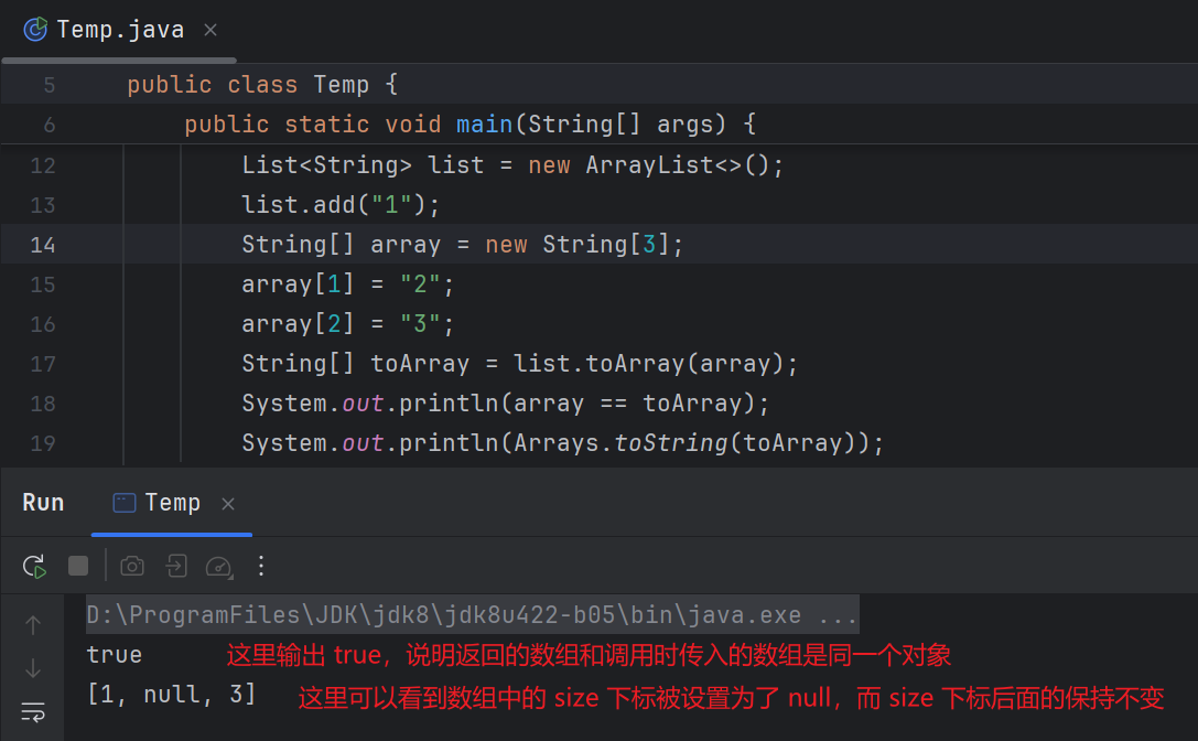当调用 toArray() 方法时传入的数组长度大于等于 ArrayList 的 size 时,则会直接把集合的元素拷贝到这个数组中。如果是大于的情况,还会把数组中下标为 size 的元素设置为 null,但是 size 下标后面的元素保持不变。如下所示: