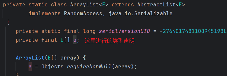 而这个 a 数组声明的类型是 E[],根据泛型擦除后的原则,这里实际上声明的类型也变成了 Object[]。 如下图所示: