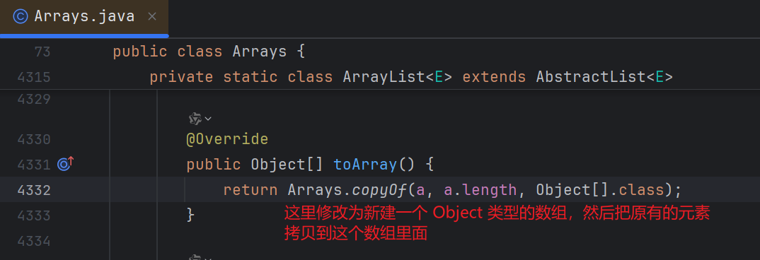 查看 Arrays 的静态内部类 ArrayList 的 toArray() 方法的返回值就是 Object[] 类型的,如下图所示: