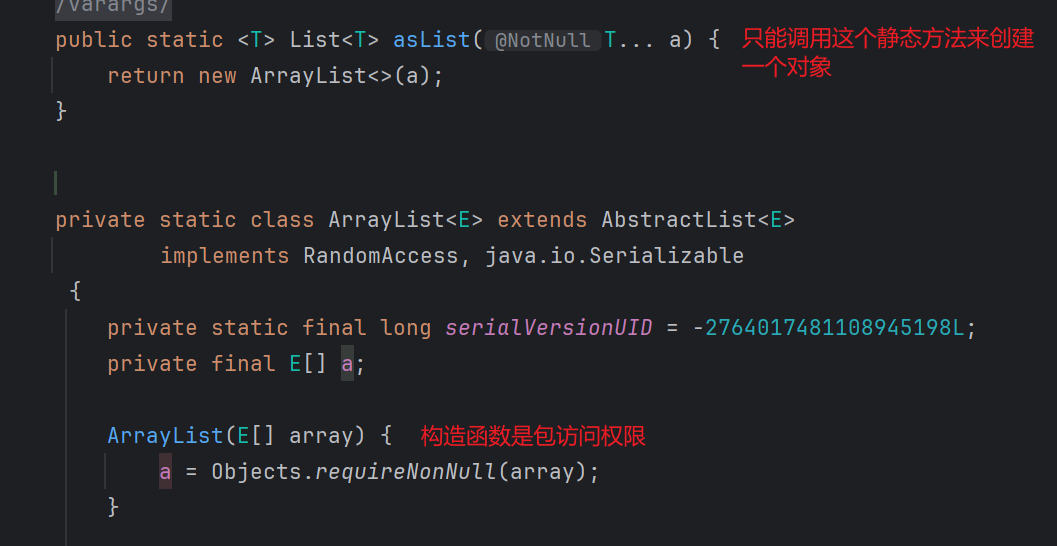 那接下来再看看 a 实际的类型是什么? 由于 Arrays 的静态内部类 ArrayList 的构造函数是包级访问的,因此只能通过 Arrays.asList() 静态方法来构造一个这个对象。如下图所示: