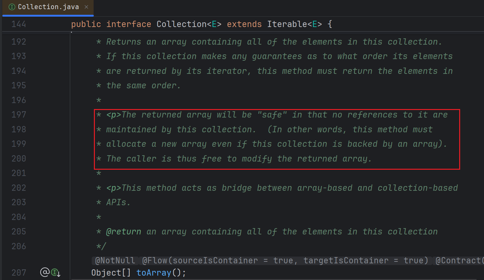 查看 Collection 接口的方法签名,方法声明明确是要返回的是一个 Object[] 类型的数组,因为方法明确声明了返回的是一个 Object[] 类型的数组,但是实际上在获取到了这个返回值后把它当作一个 Object[] 类型的数组使用某些情况下是不满足语义的。