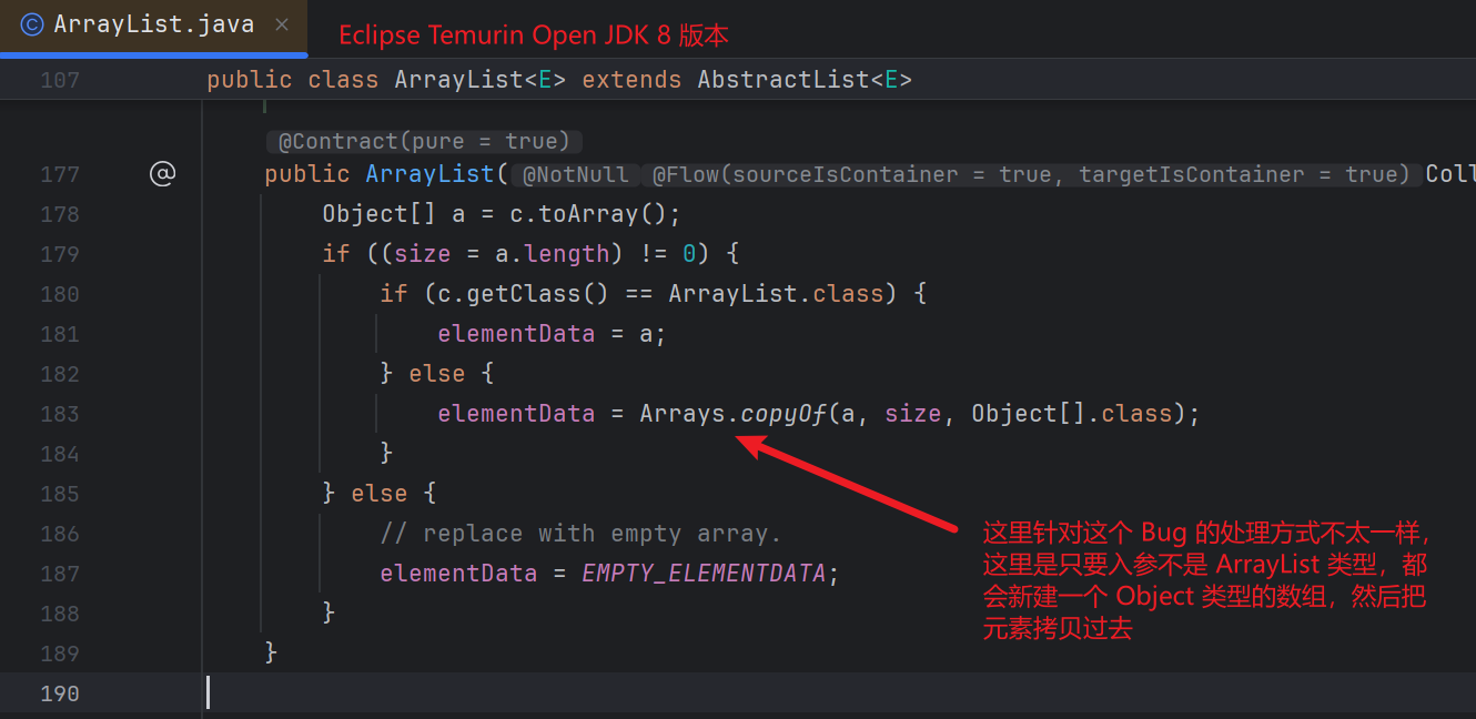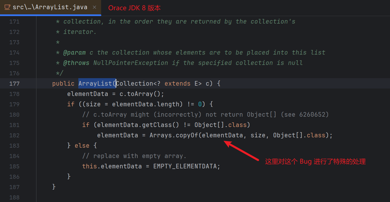 在 java.util.ArrayList 类的入参为 Collection\<? exends E> 类型的构造函数中就涉及到可能调用 Arrays 的静态内部类 ArrayList 的 toArray() 方法,JDK 在实现的时候针对这个 Bug 还做了特殊的处理,不同厂商发行的 JDK 处理方式还有细微的不同。