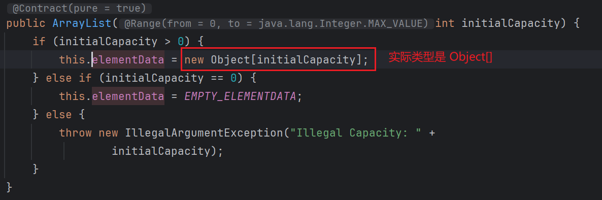 从上面可以看出 toArray() 方法是拷贝了一个 ArrayList 内部的数组对象,然后返回的。而 elementData 这个数组在实际初始化的时候,就是 new 了 Object 类型的数组。如下图所示: