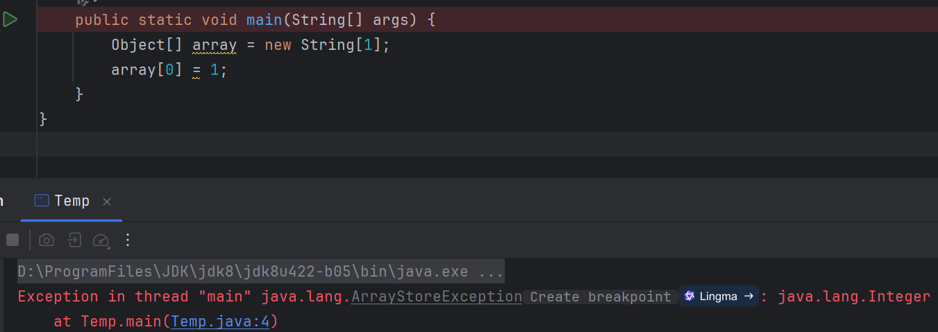 System.out.println(Arrays.toString(array));再次执行代码,结果就会抛出 ArrayStoreException 异常,这个异常表明这里并不能把一个 Integer 类型的对象存放到这个数组里面。如下图所示:
