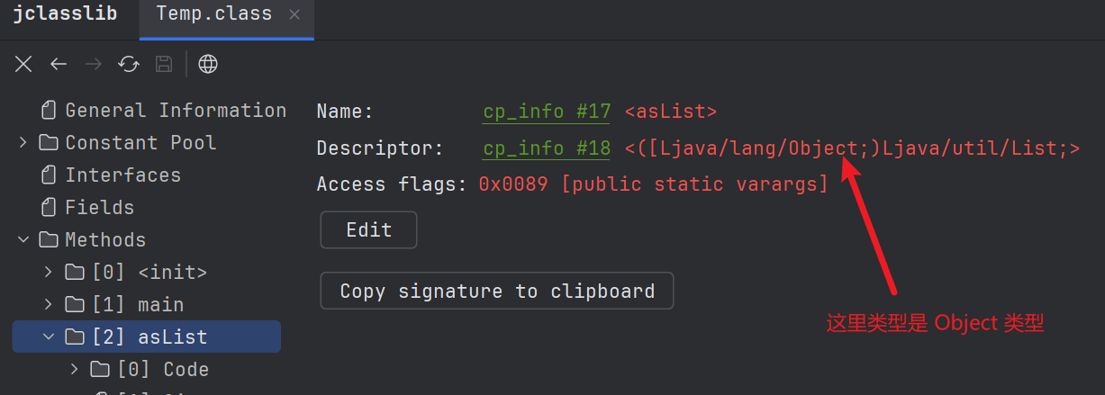 而 Arrays.asList() 方法的签名是变长参数类型,这个是 Java 的一个语法糖,实际对应的是一个数组,泛型擦除后就变成了 Object[] 类型。如下图所示: