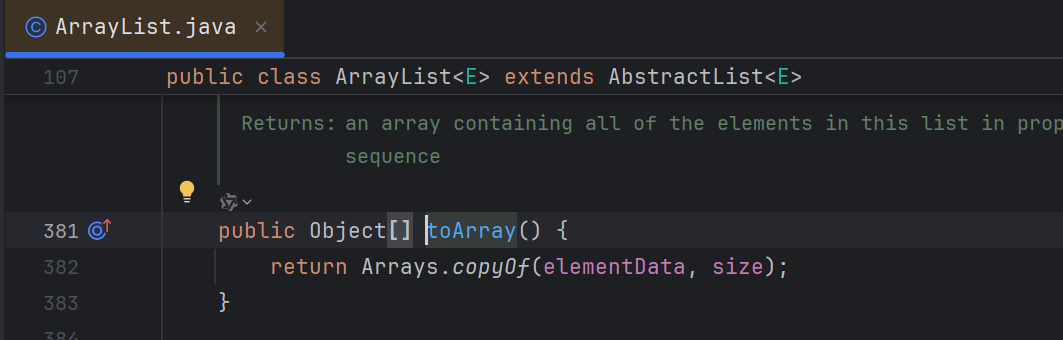 首先看下 java.lang.util.ArrayList 类的 toArray() 方法的实现逻辑: