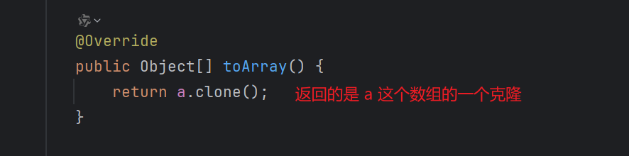 然后再看下 Arrays 的静态内部类 ArrayList 的 toArray() 方法的实现逻辑。这里返回的是 a 这个数组的一个克隆。如下图所示: