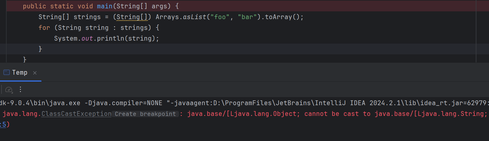 }但是如果升级到 JDK 9 版本,就会报 ClassCastException 异常了,如下图所示: