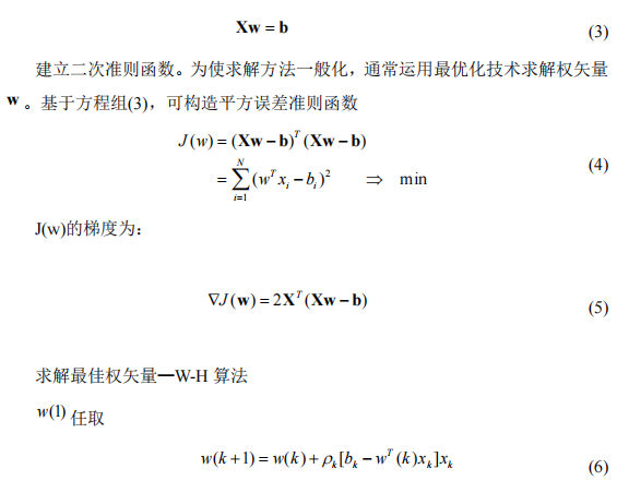 成立,即不等式组是一致的,有解。若训练模式是非线性可分的,表明不存在权矢量w对所有的训练模式都能正确分类,也就是说,无论任何的权矢量w,都有某些模式被错分,不等式不能都成立,即不等式组是不一致的,不等式组无解。在这种情况下,我们希望所求得的权矢量使尽可能多的不等式被满足,等价地说,使最少的训练模式被错分,或所得界面较稳健使对待分类模式有较好的分类效果。