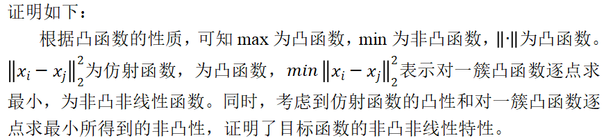 2)其次,模型中存在两类约束:凸约束和非凸约束。其中凸约束(1)的成立基于凸集的定义,即对于集合D中的任意两点及其之间的任意点,若这些点都满足特定条件,则D被称为凸集。然而,(2)作为非凸约束,其特性在于它无法保证集合内任意两点间的连线仍在集合内部。