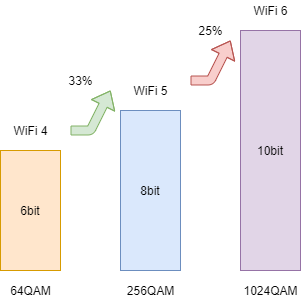 高阶调试方式:WiFi 6 支持 1024-QAM ,高于 WiFi 5 的 256-QAM ,单载波承载的数据量可以达到 10bit,意味着更高的数据传输速率。