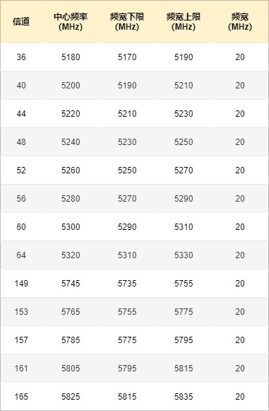 WLAN 的 5G 信道频宽资源就丰富些,一共是 700MHz 的频宽,频率范围是 5.15 ~ 5.85 GHz ,中国一共有 13 个 20MHz 信道,信道编号是 36 、40 、44 、48 、52 、56 、60 、64 、149 、153 、157 、161 、165 ,并且所有信道都是互不干扰的,可以直接使用。