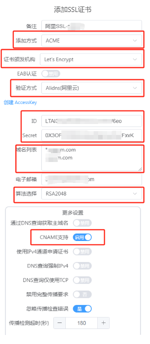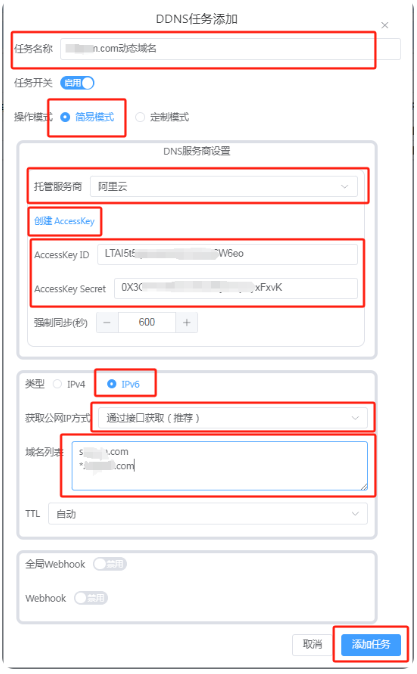 4、验证方式、密钥、域名与添加DDNS时一样,选择对应的DNS服务商填好AccessKey或Token