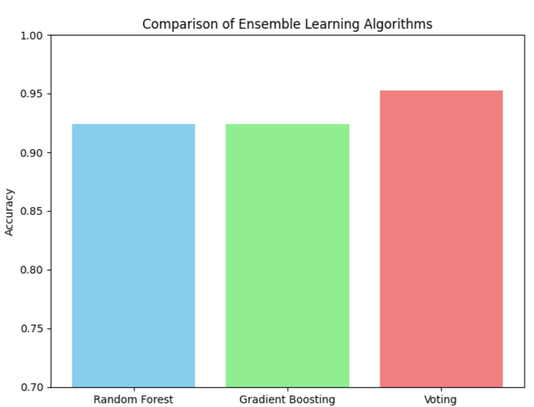 在图表中,您可以看到不同集成学习方法的准确率。通常,RandomForestClassifier 和 GradientBoostingClassifier 都能取得较高的准确率,而 VotingClassifier 由于集成了多种模型,能够进一步提升准确度,尤其是在多样化的数据集上。