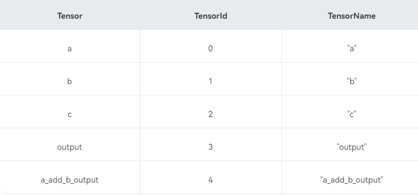 首先,根据设计的图算子结构,分别计算出图输入Tensor(假设为x个),图输出Tensor(假设为y个)以及图中间Tensor(假设为z个)的个数。 图输入Tensor的Id取值为[0, x - 1],图输出Tensor的Id取值为[x, x + y - 1],图中间Tensor的Id取值为[x + y, x + y + z - 1]。示例对应关系见表1Tensor与TensorId列。