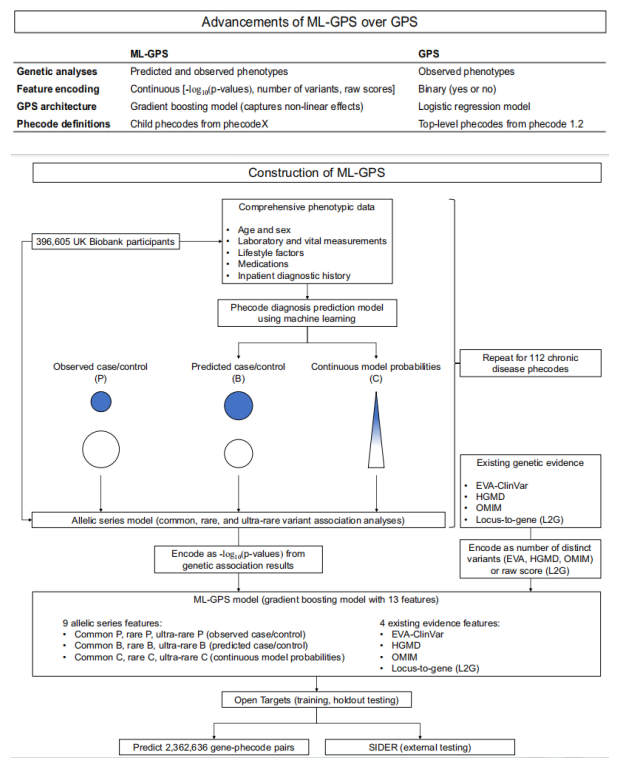 今天为大家介绍的是来自美国西奈山伊坎医学院的Ron Do教授团队的一篇论文。识别慢性疾病的遗传驱动因素对于药物发现至关重要。在本文中,作者开发了一种机器学习辅助的遗传优先评分(ML-GPS),它将遗传关联与预测的疾病表型结合起来,以增强靶点发现。首先,作者构建了梯度提升模型,用于预测英国生物样本库中112种慢性疾病的表型代码,并分析预测表型和观察表型与常见、罕见和极罕见变异的关联,以建立等位基因系列模型。作者通过带有连续特征编码的梯度提升算法,将这些关联与现有证据整合,构建了ML-GPS,并在Open Targets平台上训练其药物指示预测能力,并在SIDER数据库中进行外部测试。随后,作者生成了ML-GPS对2,362,636个基因-表型代码对的预测结果。作者发现,使用预测表型能比观察表型识别出更多跨等位基因频谱的遗传关联,从而显著提升了ML-GPS的性能。ML-GPS扩展了药物靶点的覆盖范围,其前1%的评分为15,077个先前无支持的基因-表型代码对提供了支持。ML-GPS还能够识别已知的靶点-疾病关系、尚无指示药物的潜在靶点,以及数种正在临床试验中的药物靶点,包括用于帕金森病的LRRK2抑制剂和用于心血管疾病的olpasiran。