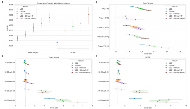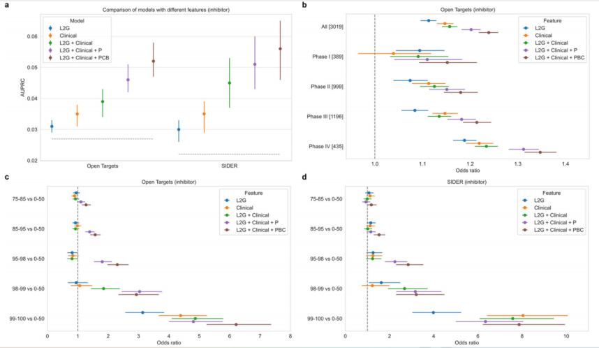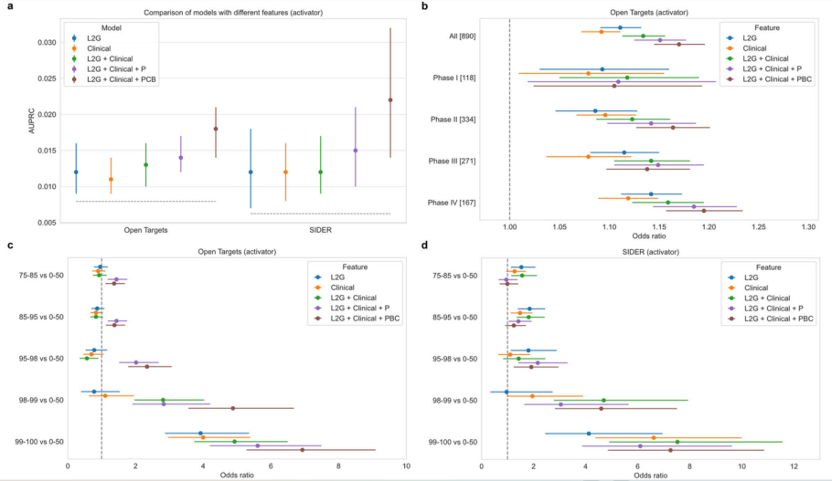 如图5所示,在激活剂指示预测中,L2G + Clinical + PBC模型在Open Targets和SIDER中的AUPRC分别为0.018和0.022,每标准差的分数增加对应OR分别为1.17和1.24。
