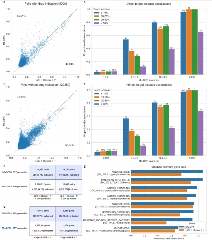 作者生成了ML-GPS和ML-GPS DOE对2,362,636个基因-表型对的预测,其中26,035个基因代表了不同的表型。如图7所示,在Open Targets和SIDER数据集中,ML-GPS比L2G + Clinical + P模型在标注药物指示方面表现更好,99分位数及以上的ML-GPS得分对应更多药物指示,表明使用C和B特征可改善药物靶点识别。