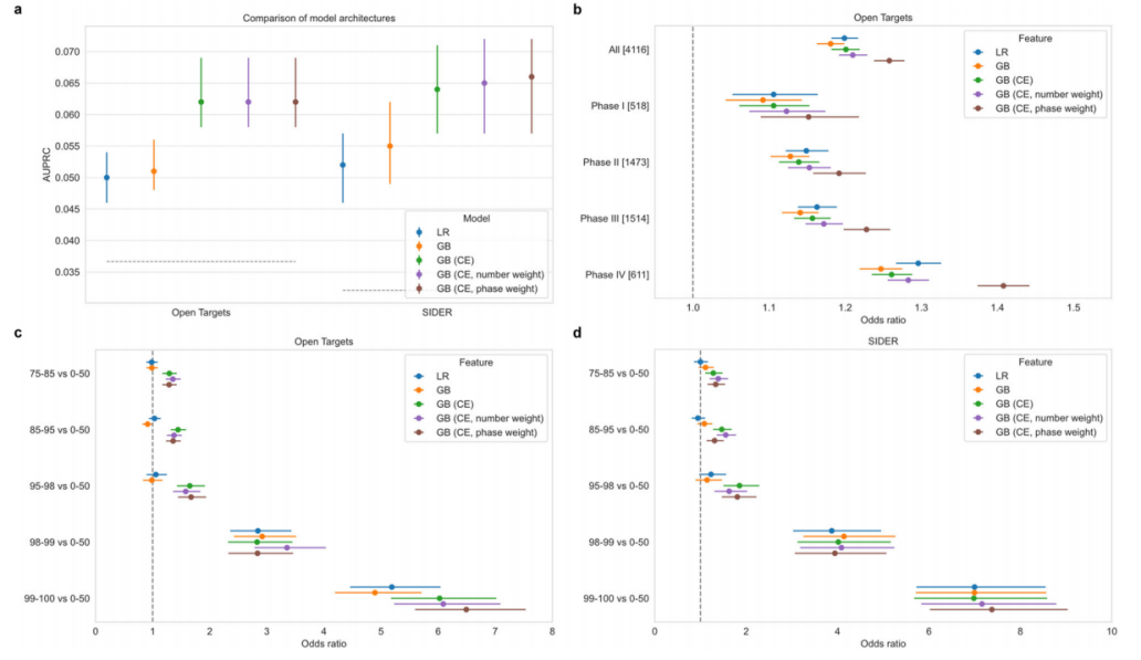 作者测试了五种模型结构,包括ElasticNet逻辑回归(LR)、梯度提升(GB)及其不同编码和权重版本。图3a显示,GB(CE, phase weights)模型在Open Targets和SIDER中的AUPRC表现最佳,优于LR和其他GB模型,其中L2G+Clinical+PBC特征组合在两数据集中提升显著。对L2G + Clinical + PBC模型的Shapley分析显示,B和C中的罕见及极罕见变异是重要特征,而OMIM特征因冗余而贡献较少。