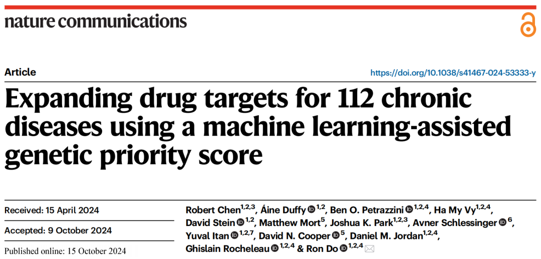 Chen R, Duffy Á, Petrazzini B O, et al. Expanding drug targets for 112 chronic diseases using a machine learning-assisted genetic priority score[J]. Nature Communications, 2024, 15(1): 8891.