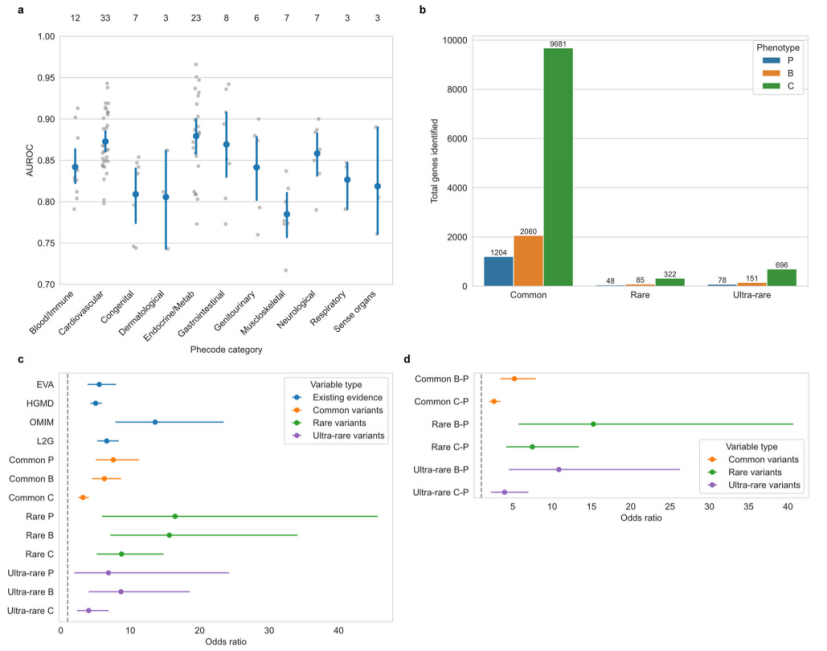 如图2b所示,在所有表型代码中,C识别的具有显著变异的基因数量远多于B,后者多于P。具体来说,常见变异分析中P、B和C分别识别了64、75和111个表型代码的基因;罕见变异分析中分别为40、46和108;极罕见变异分析中为53、61和109。B和C识别的基因与P的重叠率显著高于模型的AUROC,表明高区分度模型能更好代表观察到的表型。此外,在三种变异分析中,C识别的基因效果量中位数在罕见和极罕见变异中高于常见变异。
